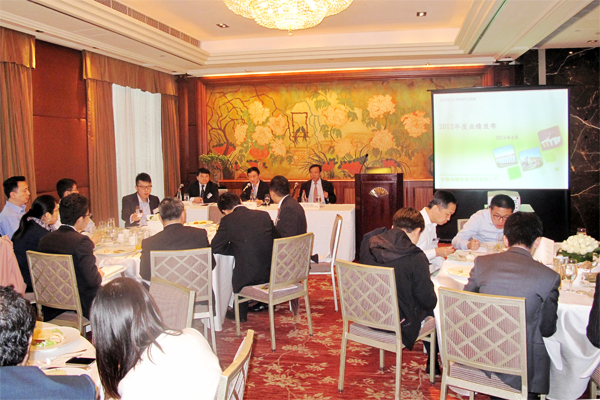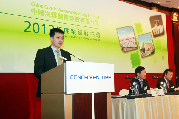 ??? ?2014年4月1日,海螺創(chuàng )業(yè)在香港港島香格里拉酒店舉行2013年業(yè)績(jì)發(fā)布會(huì ),公司董事長(cháng)郭景彬、執行董事兼總經(jīng)理紀勤應、公司秘書(shū)疏茂、財務(wù)部副部長(cháng)陳興強等參加會(huì )議。這是海螺創(chuàng )業(yè)自去年12月19日上市后首次召開(kāi)業(yè)績(jì)發(fā)布會(huì ),倍受市場(chǎng)關(guān)注,近138名投資者及分析員參加了會(huì )議,現場(chǎng)座無(wú)虛席,會(huì )場(chǎng)氣氛熱烈而隆重。