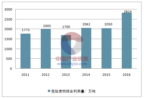 ? ? 2、2016 年危廢綜合利用量為2824 萬(wàn)噸,同比增長(cháng)38%