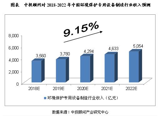 ? ? 綜合以上因素,我們預計,2018年我國環(huán)境保護專(zhuān)用設備制造行業(yè)收入將達到3,560億元,未來(lái)五年(2018-2022)年均復合增長(cháng)率約為9.15%,2022年將達到5,054億元。